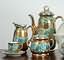 SERVIZIO DA CAFFE' per 6 persone in porcellana verde e oro, decorazione eseguita da Richard Ginori (1930), con zuccheriera, lattiera e caffettiera.Alcune imperfezioni. | 200 | |||